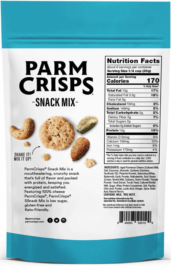 Aged Parmesan Cheese (Cultured Milk, Salt, Enzymes), Almonds, Cashews (Cashews, Sunflower Oil), Pistachio Kernels, Seasoning (Chey, Buttermilk, Garlic Powder, Maltodextrin, Sour Cream (Cream, Nonfat Milk, Cultures), Onion Powder, Tomato Powder, Yeast Extract, Torula Yeast, Cultured Nonfat Milk, Sugar, (Whey Protein Concentrate, Salt, Paprika, Citric Acid, Parsley, Lactic Acid, Vinegar, Spice, Malic Acid, Natural Flavor).